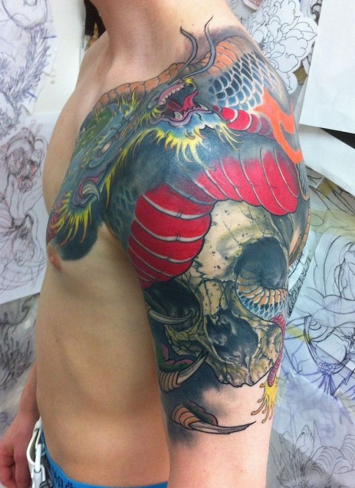 chiński smok na czaszce tatuaże na ramieniu