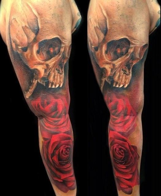 czaszka i czerwone róża tatuaże na ręce