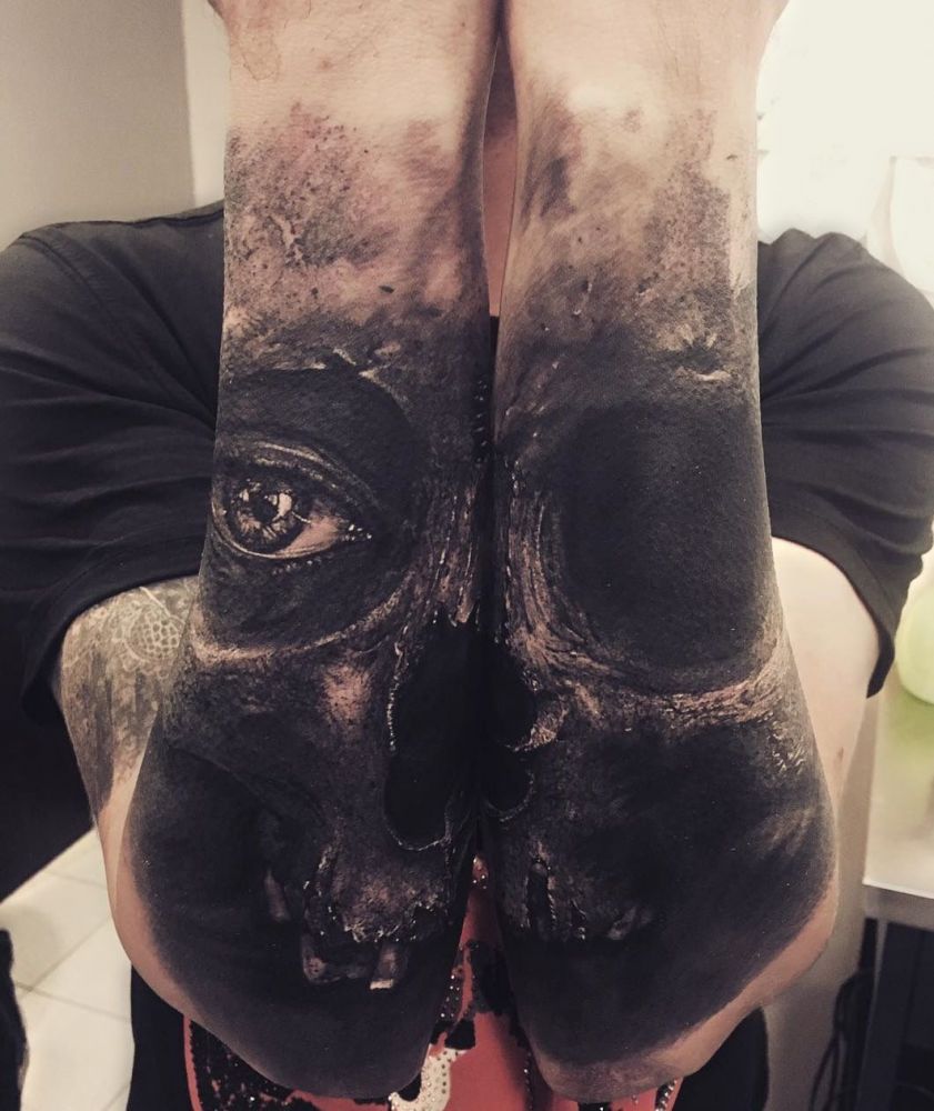 czaszka na dwóch rękach - piękny tatuaż