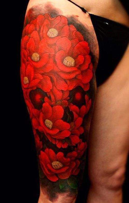 czerwone kwiaty tatuaże na udzie