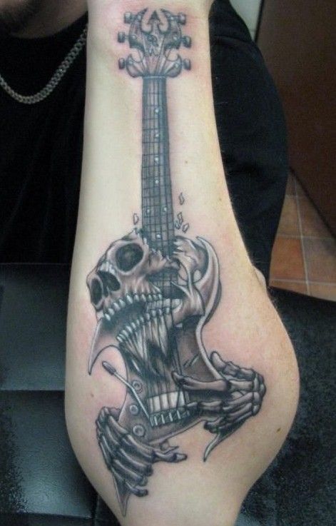 gitara z czaszką tatuaż na ręce