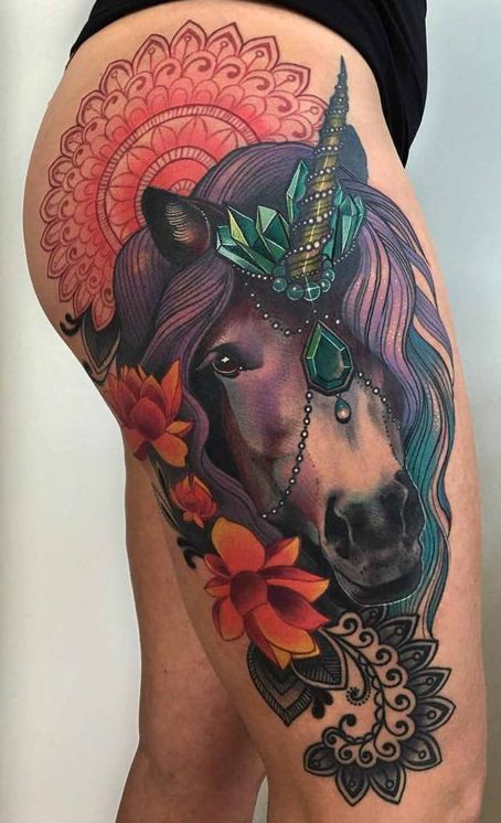 jednorożec tatuaż na biodrze