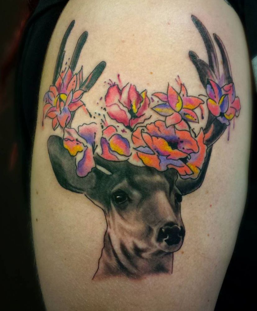 jeleń z kwiatami na głowie