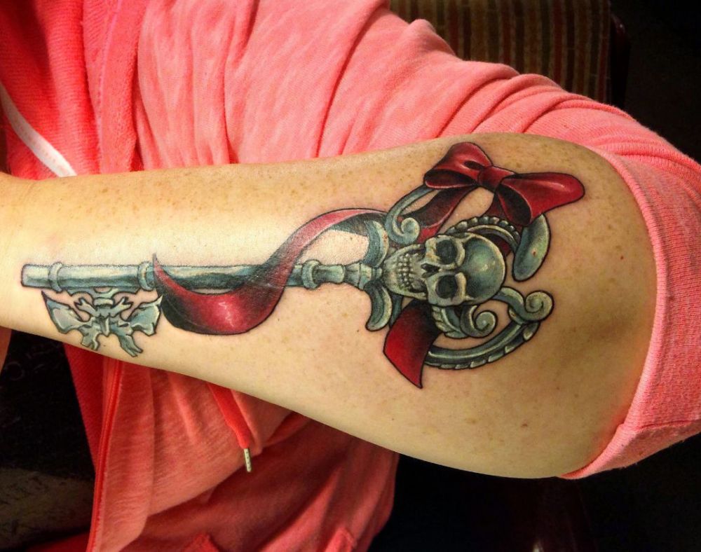 klucz czaszka z czerwoną kokardą