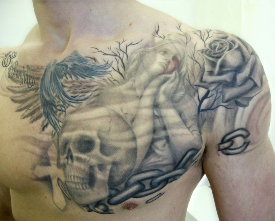 kobieta różai czaszka tatuaże na klatce piersiowej
