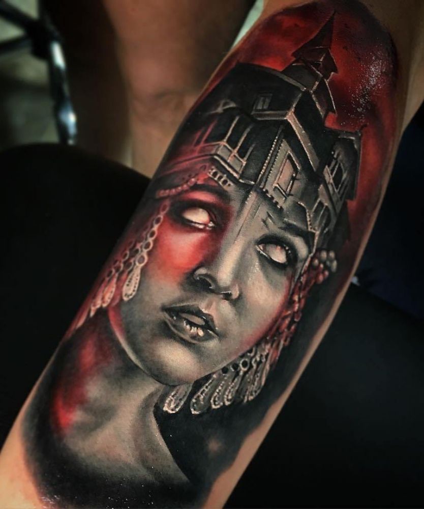 kobieta z katedrą na głowie