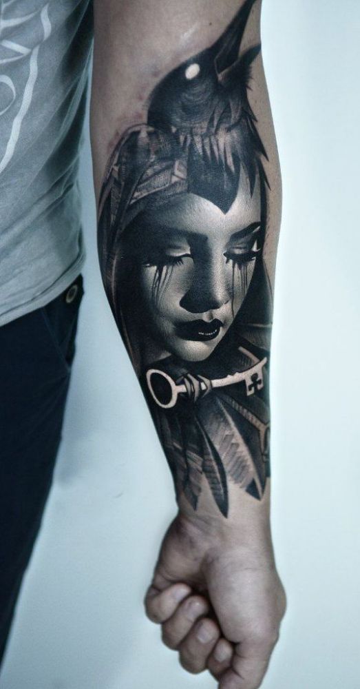 kruk z kluczem i twarz kobiety