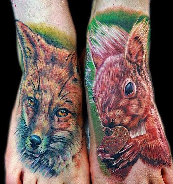 lis i wiewiórka tatuaże na stopach