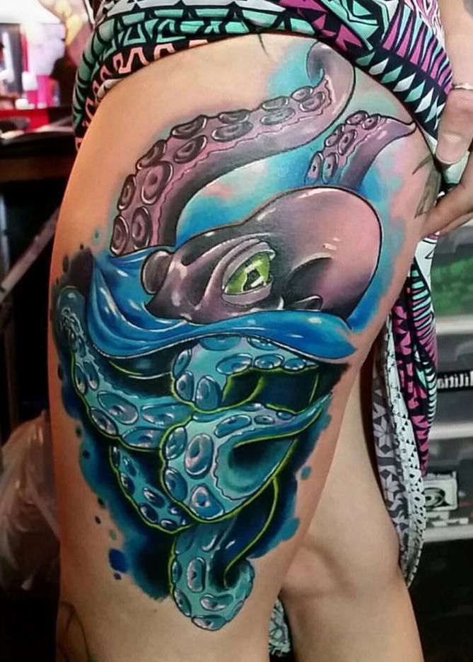 ośmiornica w wodzie tatuaż na udzie