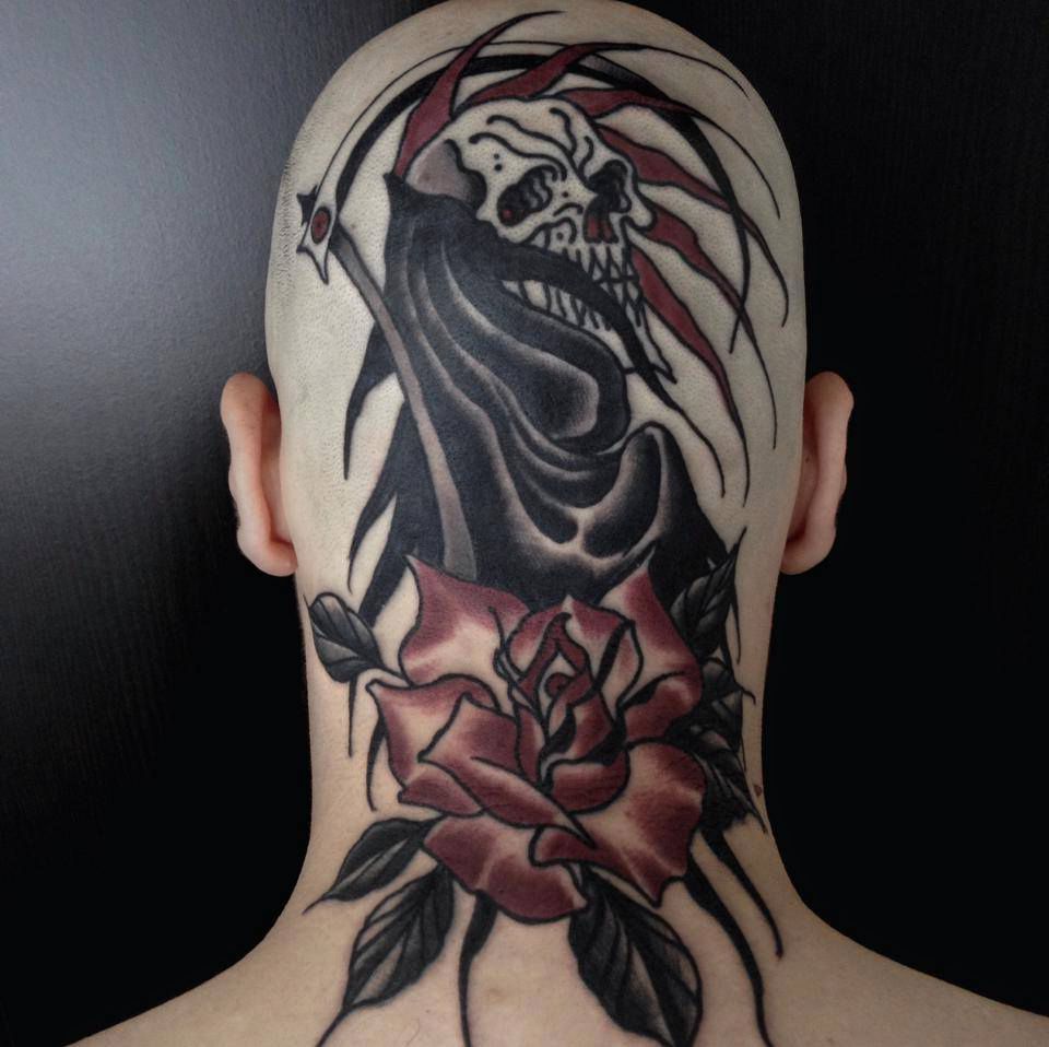 śierć i kwiatek tatuaż na głowie