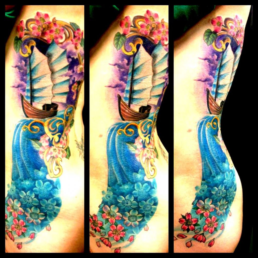 statek woda i kwiaty tatuaże