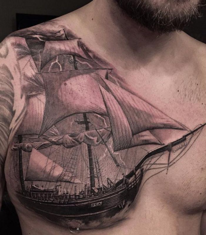 statek wytatuowany na klatce piersiowej