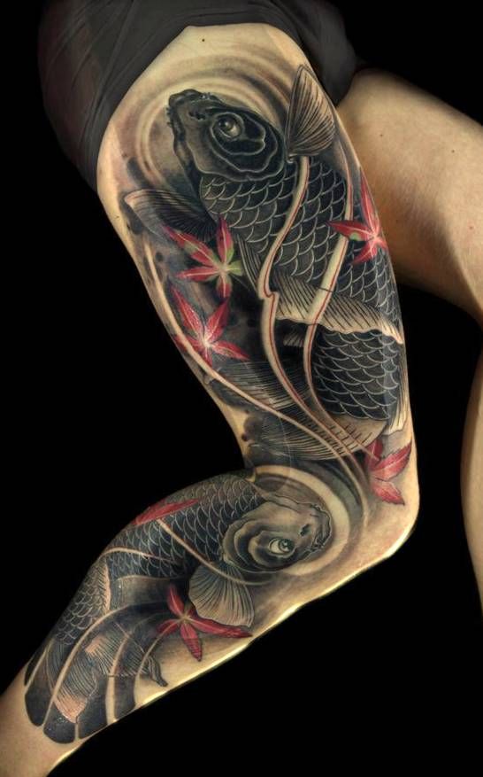 tatuaże ryby koi na nodze