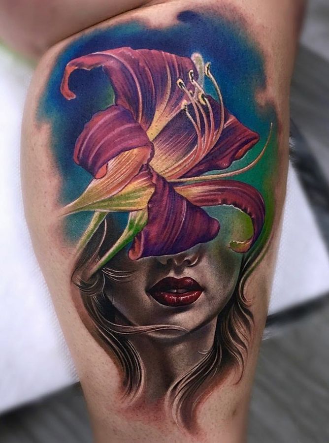 twarz kobiety przysłonięta kwiatkiem