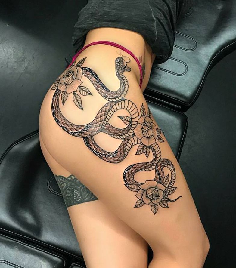 wąż i kwiaty tatuaż na udzie