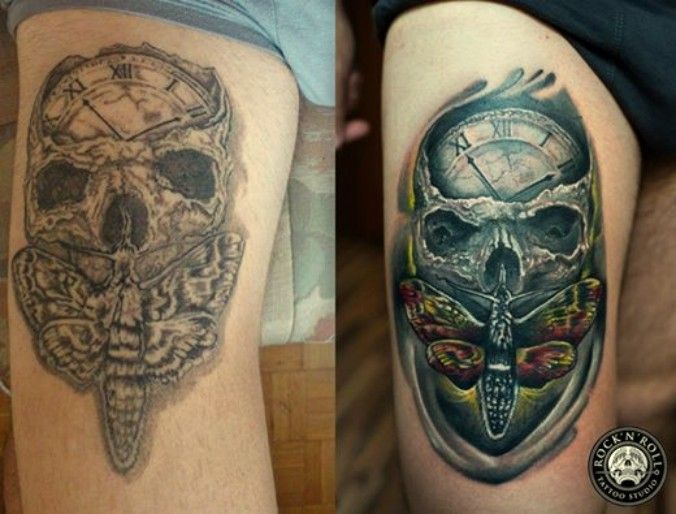 zegar czaszka ćma, tatuaże na udzie